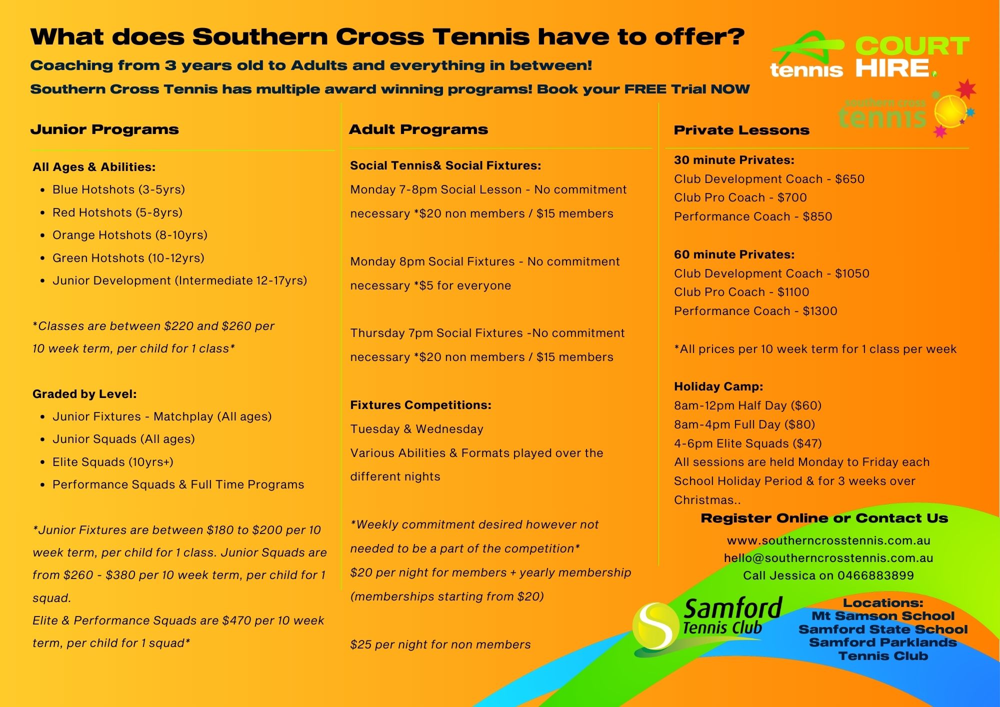 Southern Cross Tennis was founded in 2009 by Jesse Catterall. SCT is located in Samford Parklands and Samford State School.